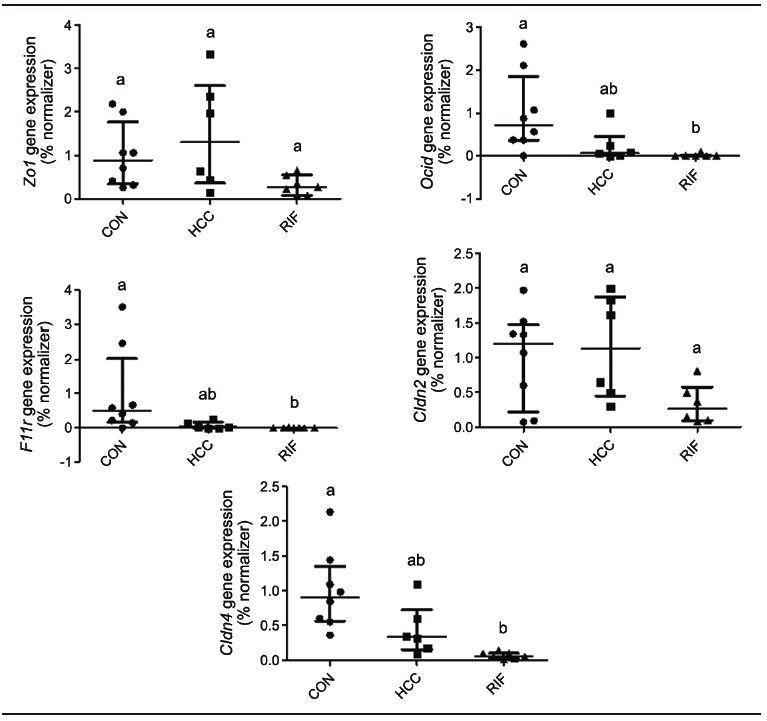 To understand the effect of rifaximin on intestinal permeability, we evaluated the expression of tight junction proteins in the small intestine (Supplementary Figure 2). There were no differences between groups for Zo1/Tjp1 and Cldn2. Ocln, JAM/F11r, and Cldn4 showed lower expression levels in the RIF group when compared to the CON group, indicating a possible effect on intestinal permeability (p = 0.002, p = 0.005, and p = 0.001, respectively), but no differences in the expression of these genes were found between the HCC and RIF groups.