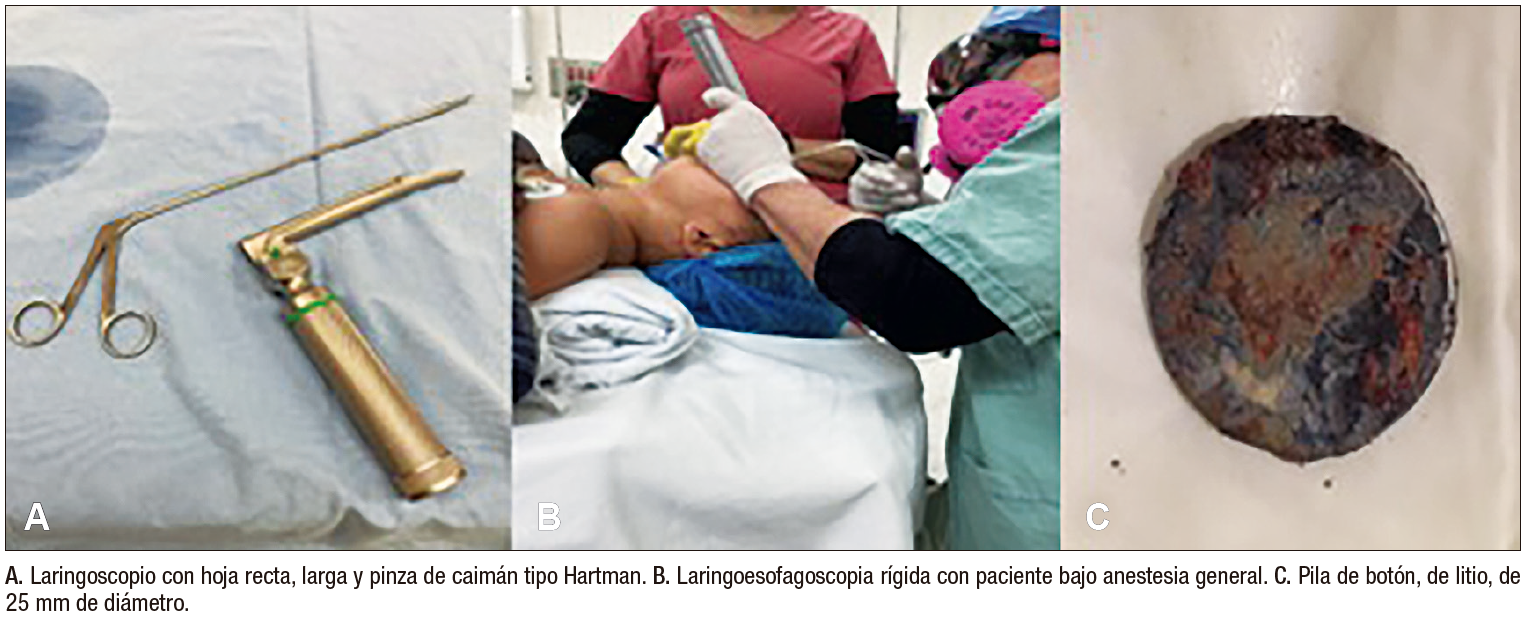utilizando un laringoscopio con hoja recta larga y una pinza de caimán tipo Hartman, lográndose su extracción al