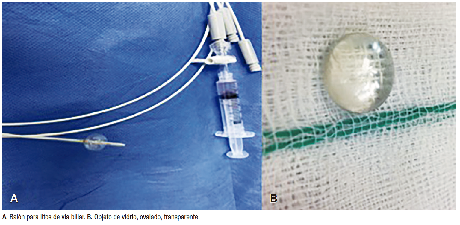 Femenino de 1 año y 10 meses de edad con ingesta de cuerpo extraño de 12 horas de evolución, con presencia de sialorrea y vómitos. Los cuidadores desconocían el objeto extraño que había ingerido. Se solicitaron radiografías simples anteroposterior y lateral de tórax, en las que se evidenció la presencia de un cuerpo extraño ovalado y radiopaco, con sospecha inicial de ser una moneda (Figura 3). Se realizó endoscopía flexible tras la intubación del paciente, encontrándose un objeto ovalado transparente, de vidrio. Se pasó, a través del canal de trabajo, un balón para litos de vía biliar, el cual se insufló distal al cuerpo extraño para extraerlo a la par del endoscopio a través de la orofaringe, bajo anestesia general, sin complicaciones (Figura 4).