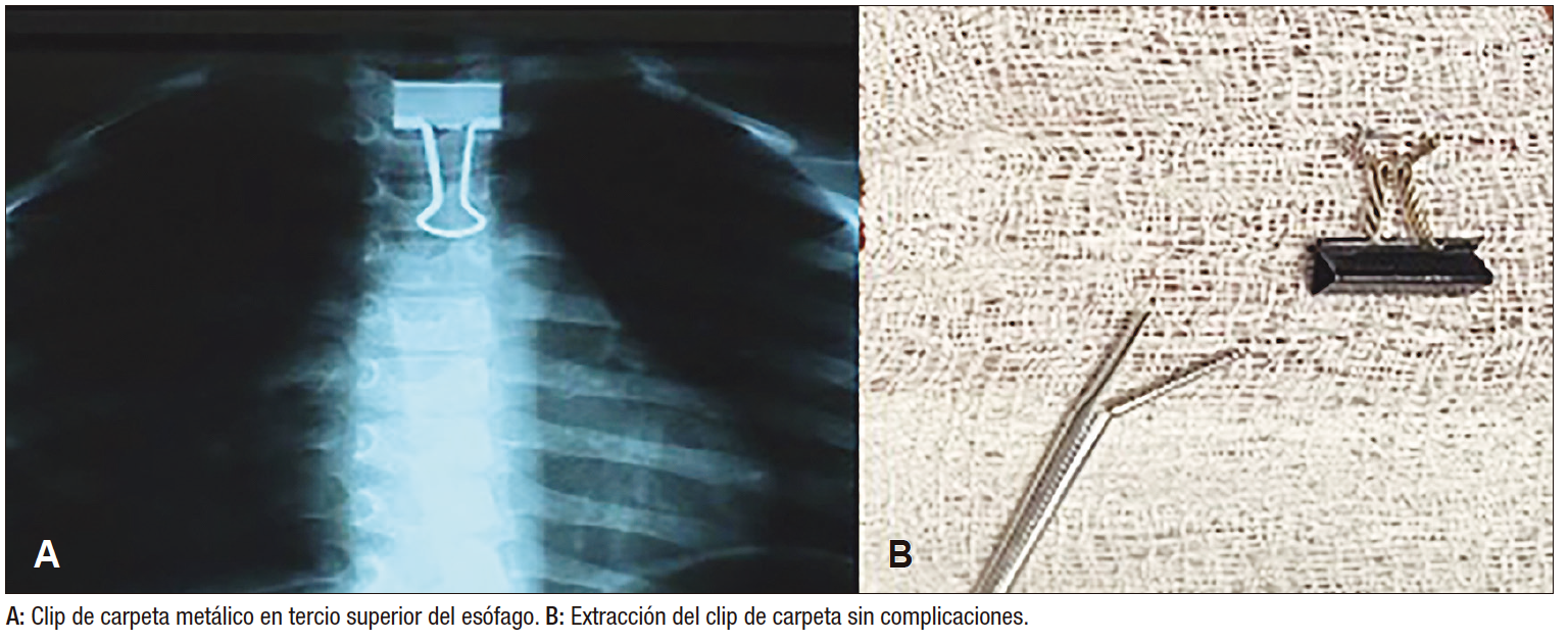 Masculino de 8 años de edad, previamente sano, que ingirió un clip metálico de carpeta, tras lo cual presentó vómitos, odinofagia y sialorrea. En la radiografía anteroposterior de cuello y tórax se observó un objeto radiopaco compatible con el clip de carpeta. Se realizó endoscopía flexible no pudiéndose extraer el objeto con pinza de dientes de ratón, cocodrilo, red ni asa, por lo que se decidió realizar, bajo anestesia general, laringoesofagoscopia rígida con laringoscopio y hoja recta larga, así como pinza de caimán tipo Hartman, lográndose extraerla al primer intento, sin complicaciones (Figura 5).