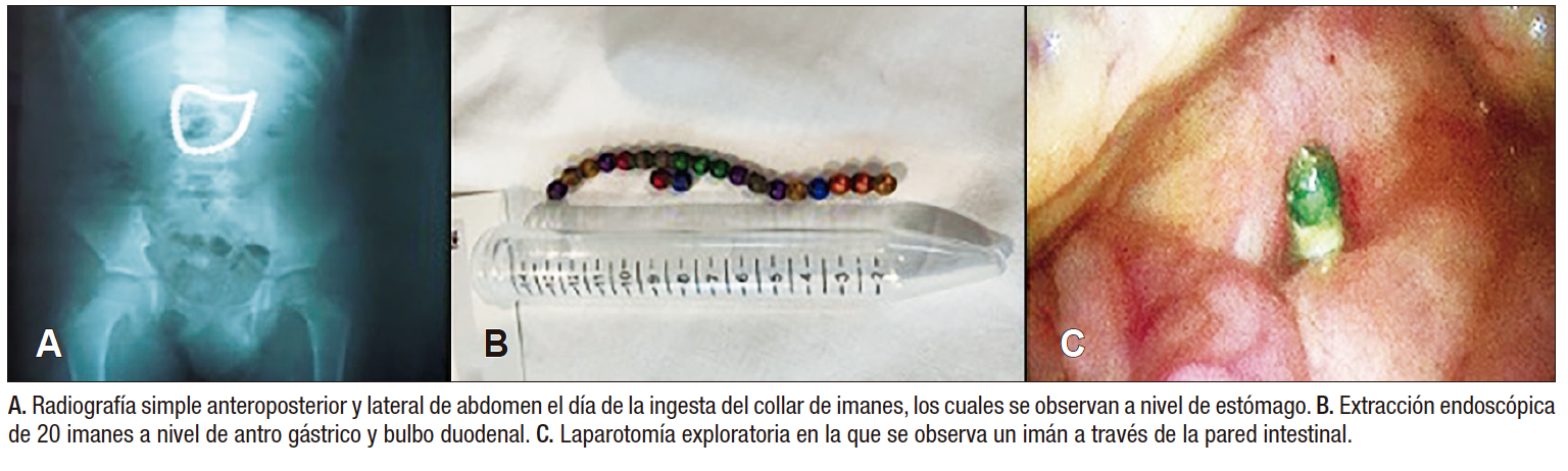 Masculino de 3 años de edad que ingirió un collar de imanes y acudió de inmediato, asintomático, a valoración por el servicio de urgencias de una institución carente de servicio de gastroenterología y endoscopía. Se solicitaron radiografías simples anteroposterior y lateral de abdomen, en las que se observó el cuerpo extraño en el estómago. Fue enviado a su casa con pautas de alarma y la indicación de verificar si el cuerpo extraño era eliminado con las evacuaciones. Los cuidadores decidieron acudir para una segunda opinión a las 72 horas, cuando se evidenció que el cuerpo extraño continuaba en el mismo lugar. Se decidió realizar endoscopía en ese momento para evitar la progresión de los imanes al intestino y, con ello, complicaciones, y se encontraron los imanes unidos en forma lineal desde el antro gástrico hasta el bulbo duodenal, en segunda y tercera porción del duodeno. Se realizó la extracción de 20 imanes mediante el uso de pinza de dientes de ratón, cocodrilo, red y asa, quedando el resto inalcanzables en la segunda y la tercera porción del duodeno. El paciente quedó hospitalizado en observación (día 4), con manejo conservador, asintomático. Se solicitó una nueva radiografía simple de abdomen a las 24 horas (día 5), encontrándose los imanes cerrados formando un collar. El paciente continuaba asintomático. Se decidió realizar laparotomía exploratoria, en la cual se evidenciaron tres perforaciones en tercera porción de duodeno y en yeyuno. Se extrajeron exitosamente el resto de los imanes y el paciente se recuperó sin más complicaciones (Figura 6).