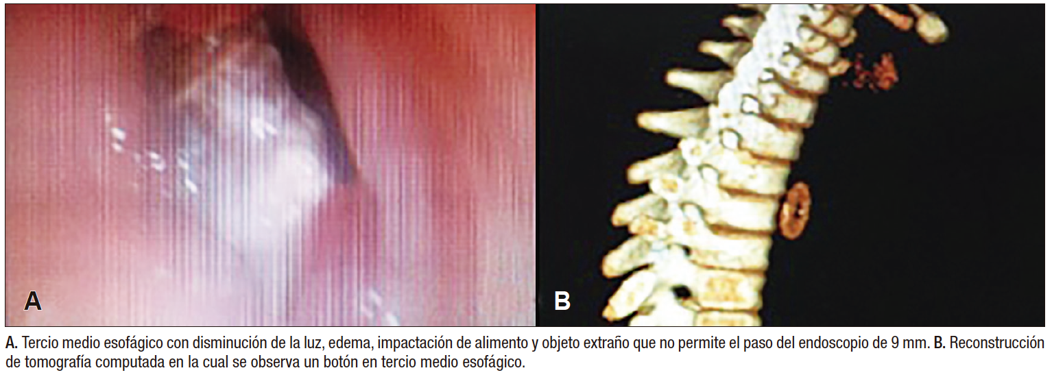 Femenino de 12 años de edad con cuadro clínico de un año de evolución, caracterizado por hiperreactividad bronquial y disfagia progresiva, inicialmente a sólidos y, posteriormente, a líquidos. Fue referida a endoscopía para descartar alteraciones a nivel esofágico, en la cual se visualizó, a nivel del tercio medio esofágico, la mucosa edematosa, ulcerada, con impactación de alimento y un aparente cuerpo extraño que no permitía el paso del endoscopio de 9 mm. Se reinterrogó a la madre, quien refirió que hacía 12 meses había ingerido el botón de un abrigo y acudió a valoración a una institución carente de servicio de gastroenterología y endoscopía, en la cual, al no observarse el botón en las radiografías, la egresaron sin tratamiento. Se decidió realizar una tomografía computada con reconstrucción de cuello, con la cual se descartaron complicaciones y se evidenció el botón de abrigo en el tercio medio del esófago (Figura 8). Se inició manejo por 72 horas con ayuno, para disminuir la cantidad de alimento impactado, esteroide para desinflamar la mucosa y lograr una extracción más fácil, e inhibidor de bomba de protones como medida de protección gástrica ante el ayuno. Se realizó nuevamente endoscopía, en la cual se movilizó el botón de 30 mm de diámetro al estómago y se extrajo mediante una red (Figura 9).