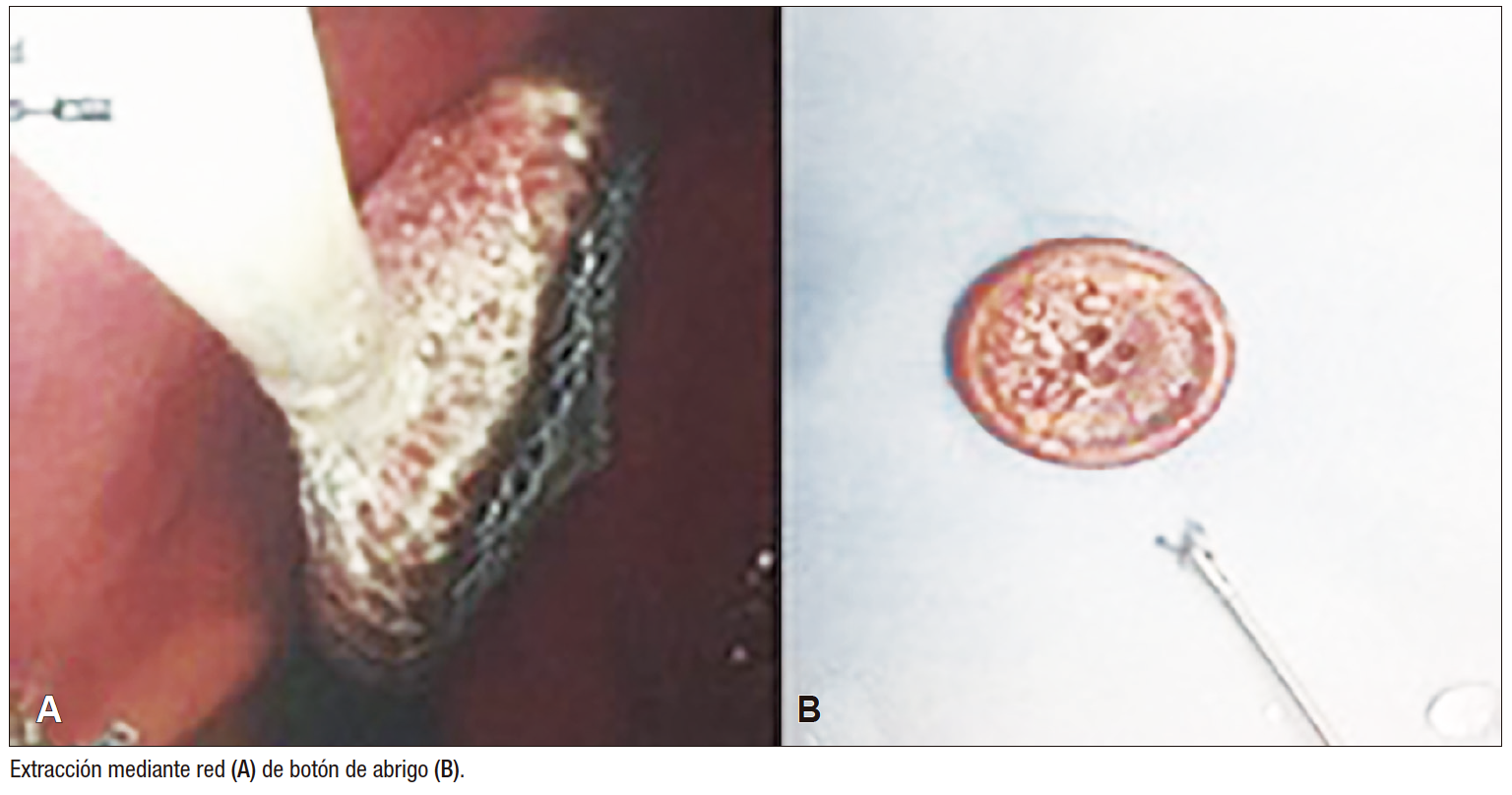 Para la extracción de objetos contundentes (monedas), anteriormente solían extraerse con sondas urinarias o bujías esofágicas por fluoroscopia;8,9 sin embargo, debido a que no se realiza bajo visualización directa y tampoco hay forma de revisar si hubo alguna lesión remanente, conllevan un mayor riesgo de complicaciones graves, por lo que no son estrategias recomendadas actualmente. Existen reportes de extracciones de cuerpos extraños en esófago con catéteres de doble balón, con buenos resultados.10 En la paciente del caso 2, se realizó la extracción con un balón para litos de vía biliar, de forma efectiva y segura.