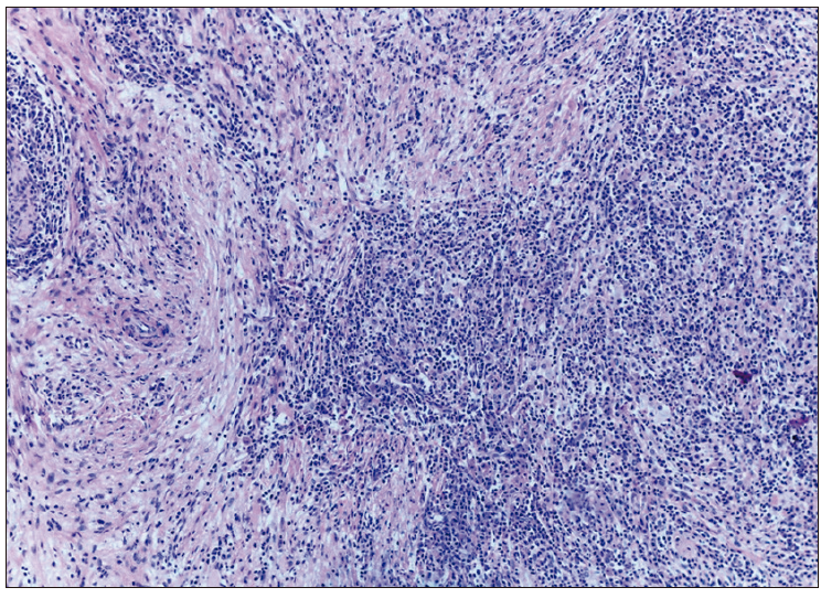 Los resultados histológicos de la pieza quirúrgica informan un infiltrado linfoplasmocitario, eosinófilos, marcada fibrosis que adopta un patrón de tipo “estoriforme” y tromboflebitis obliterativa. En la inmunohistoquímica se observa un promedio de 156 células plasmáticas IgG4 positivas. Dichos hallazgos histológicos son sugestivos de pseudotumor inflamatorio relacionado a IgG4 (Figuras 3 y 4).