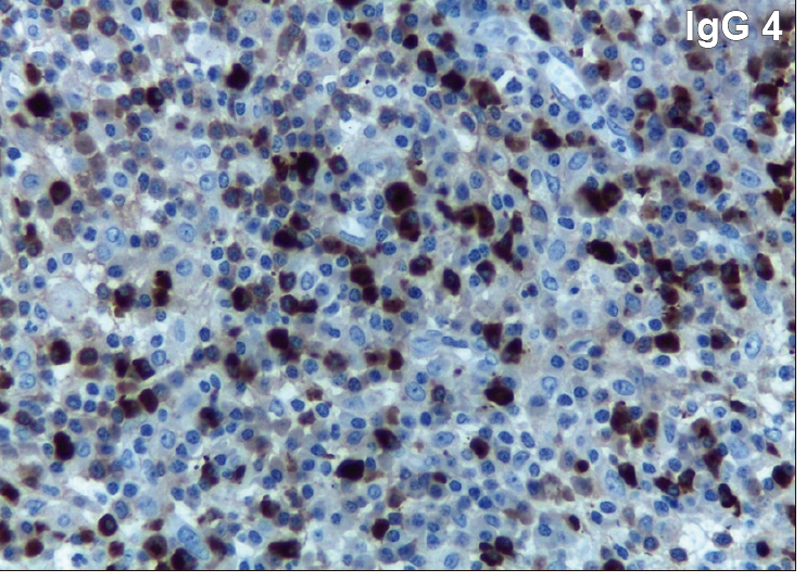 La enfermedad relacionada con IgG4 es una afección inflamatoria crónica caracterizada por la infiltración tisular de linfocitos y células plasmáticas secretoras de IgG4, y la presencia de fibrosis estoriforme. Generalmente tiene una respuesta rápida al tratamiento con corticoides. Presenta diversas manifestaciones inflamatorias como pancreatitis autoinmune, colangitis esclerosante, sialoadenitis, dacrioadenitis, entre otras; y formas raras de lesiones sólidas conocidas como pseudotumores relacionados con IgG4.