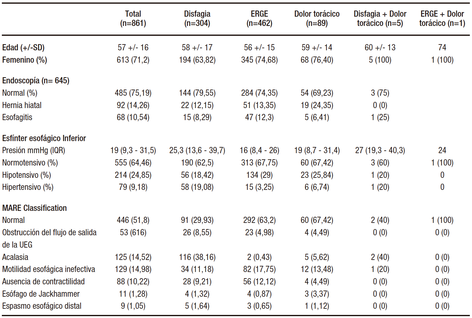 Del total de 861 pacientes, 304 (35%) pacientes presentaron disfagia, 462 (54%) síntomas de ERGE, 89 (10%) dolor torácico, 5 (0,6%) disfagia y dolor torácico y 1 (0,1%) síntomas de ERGE y dolor torácico.