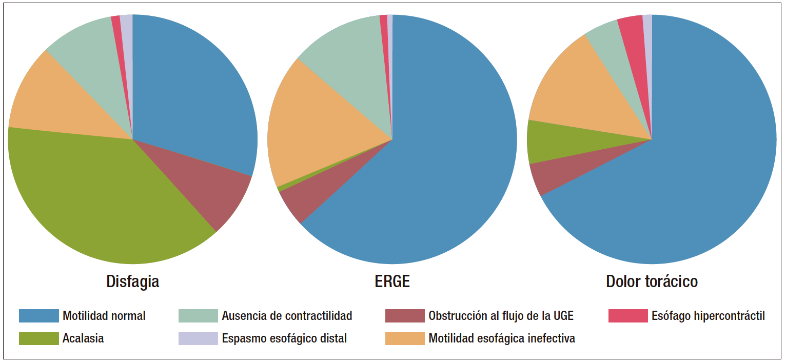 En este estudio, el 48% de los pacientes presentó un trastorno motor, de acuerdo con la clasificación de Chicago v3.0. La MEI fue el patrón manométrico más común, seguido de la acalasia, la ausencia de contractilidad, la obstrucción de flujo de salida de la UGE, el esófago de Jackhammer y, por último, el EED.