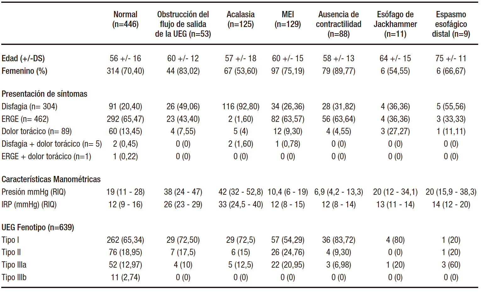 Observamos que 53 pacientes tuvieron obstrucción del flujo de salida del UGE, 125 acalasia, 129 MEI, 88 ausencia de contractilidad, 11 esófago de Jackhammer, 9 espasmo esofágico distal y 446 manometría normal. Los perfiles demográficos y sintomáticos de los pacientes sobre la base de los hallazgos de la MARE se describen en la Tabla 2. Los pacientes en el grupo de espasmo esofágico distal fueron los de mayor edad y había más mujeres en el grupo de ausencia de contractilidad.