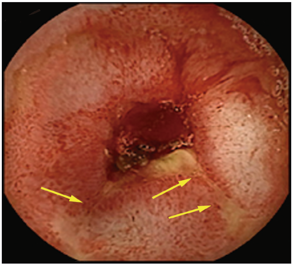 La presentación clínica de la GNM intestinal es variable y depende de la ubicación y extensión de la lesión. Los síntomas más frecuentes son los cambios en el hábito intestinal, el dolor abdominal y los episodios oclusivos por formación de estenosis, como en nuestro caso. Algunos pacientes pueden permanecer asintomáticos durante décadas.12 La hemorragia oculta o la anemia ferropénica secundaria a la ulceración de la mucosa intestinal son complicaciones raras, lo que hace que el proceso de diagnóstico sea desafiante.13 El diagnóstico diferencial de segmentos con estenosis y engrosamiento de la pared intestinal en el íleon distal incluyen isquemia crónica, lesiones por radioterapia, citomegalovirus, enfermedad de injerto contra huésped, enteropatía por AINEs, linfoma y amiloidosis.14-15