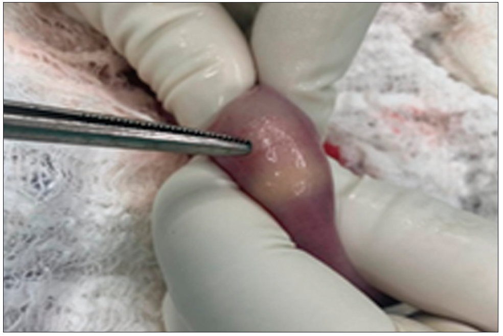 A las 12 horas del estudio la paciente presentó un cuadro de suboclusión intestinal. La radiografía directa de abdomen mostró asas del intestino delgado dilatadas y la sospecha de que la CE se encontraba en el hipogastrio. La TC de abdomen con sustracción de imágenes demostró la ubicación de la cápsula en el intestino delgado. Se decidió realizar una laparotomía exploradora en la que se examinó el intestino delgado desde el ángulo duodenoyeyunal, donde se observaron asas dilatadas con las paredes engrosadas. A los 80 cm de la válvula íleocecal se encontró la CE en funcionamiento (Figura 4). Se realizó una ileostomía con extracción de la CE. A 10 cm del sector proximal de la ubicación de la CE se observaron varias estenosis y una fístula entero-entérica, por lo que se decidió realizar la resección de 40 cm de intestino delgado aproximadamente, con anastomosis termino-terminal (Figura 5).