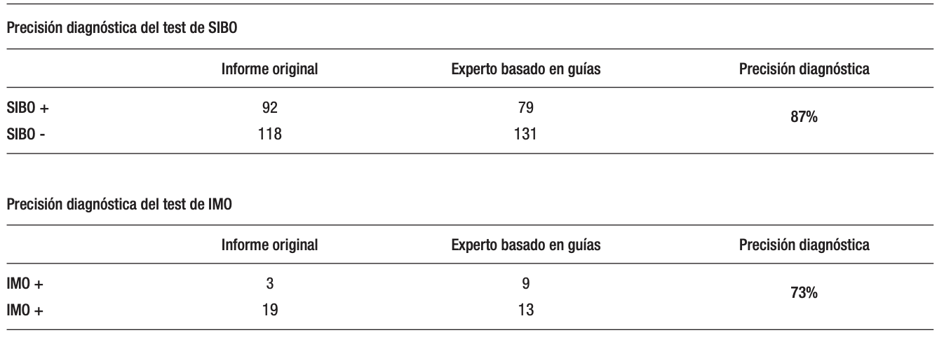 Para evaluar la precisión diagnóstica, un experto ciego a los resultados de los informes y basándose en los puntos de corte fijados por las guías americanas consignó un resultado de SIBO e IMO para los valores de hidrógeno y metano previamente enmascarados. Este resultado se comparó con los resultados originales y se calculó el porcentaje de aciertos diagnósticos. Se optó por utilizar las guías americanas como referencia diagnóstica debido a la precisión de sus puntos de corte para hidrógeno (H2 ≥ 20 ppm) y metano (CH4 ≥ 10 ppm), lo que favorece la estandarización y la consistencia en la interpretación de los resultados.