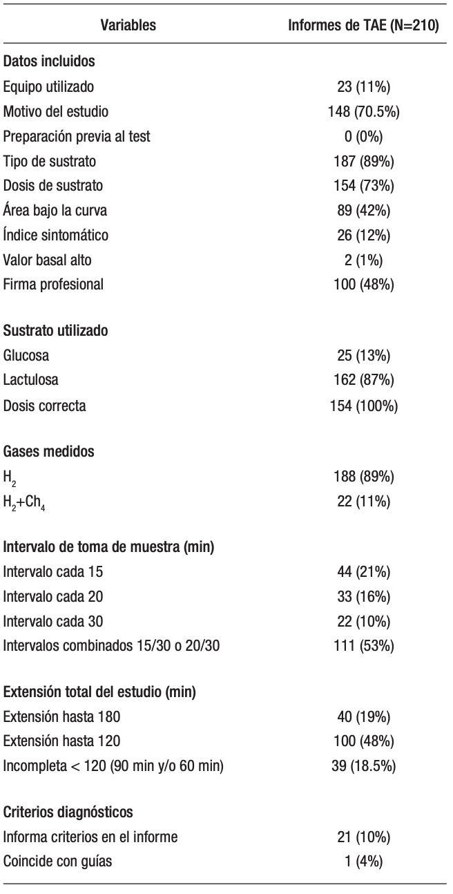 La mayoría de los estudios analizados carecían de estandarización en aspectos claves como los intervalos de muestreo, la extensión del test y los puntos de corte utilizados. Más del 50% de los estudios utilizó una combinación de intervalos para la toma de muestra, cuando las guías recomiendan intervalos fijos cada 15 o 20 minutos. Se encontró casi un 20% de estudios incompletos, llegando a una extensión de 180 minutos solo un 19%. Los puntos de corte utilizados se especificaron solo en el 10% de los casos, estando en concordancia con las guías actuales en un 4%. Más del 80% de los estudios midieron exclusivamente hidrógeno cuando las recomendaciones vigentes sugieren la medición concomitante con metano.20,21,42 Por otro lado, la calidad de los informes fue subóptima, cumpliendo solo 5 de los 13 criterios establecidos como esenciales.