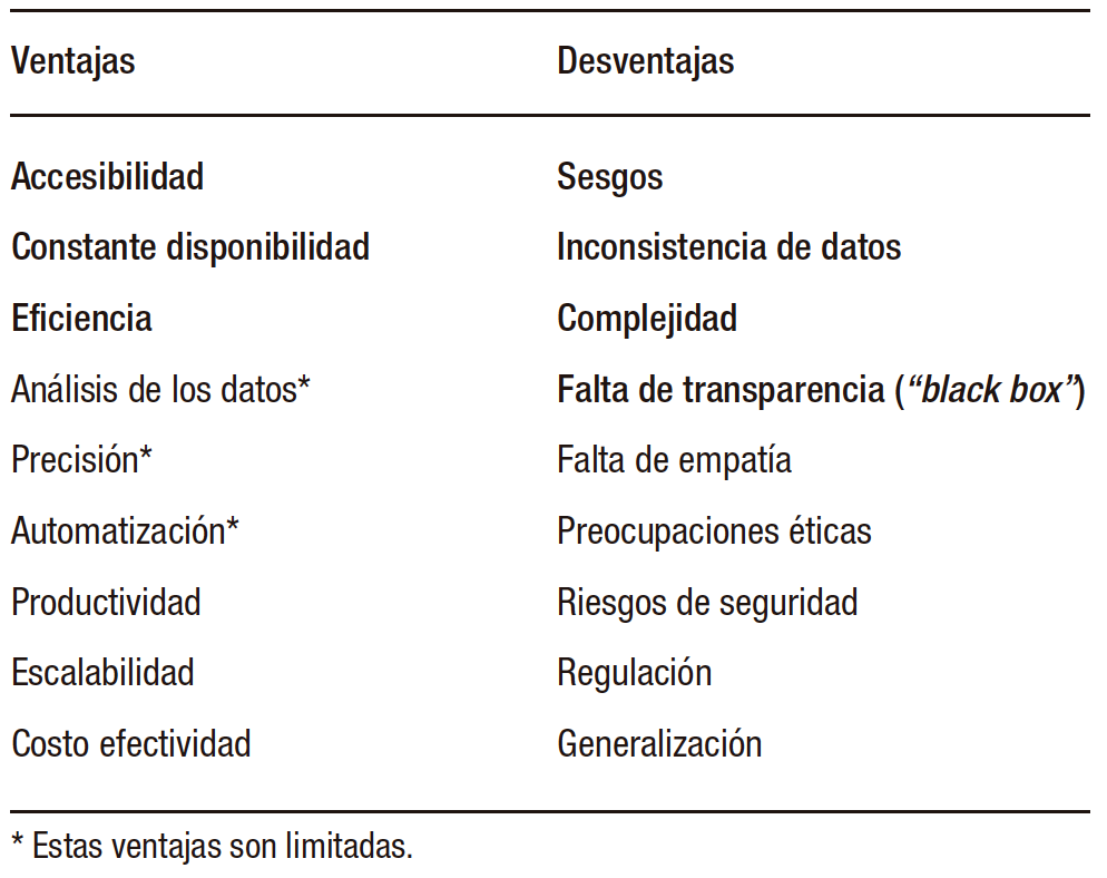 Sin embargo, la IA tiene ventajas y desventajas que hay que tener en cuenta, como se enumera a continuación en Tabla 1.
