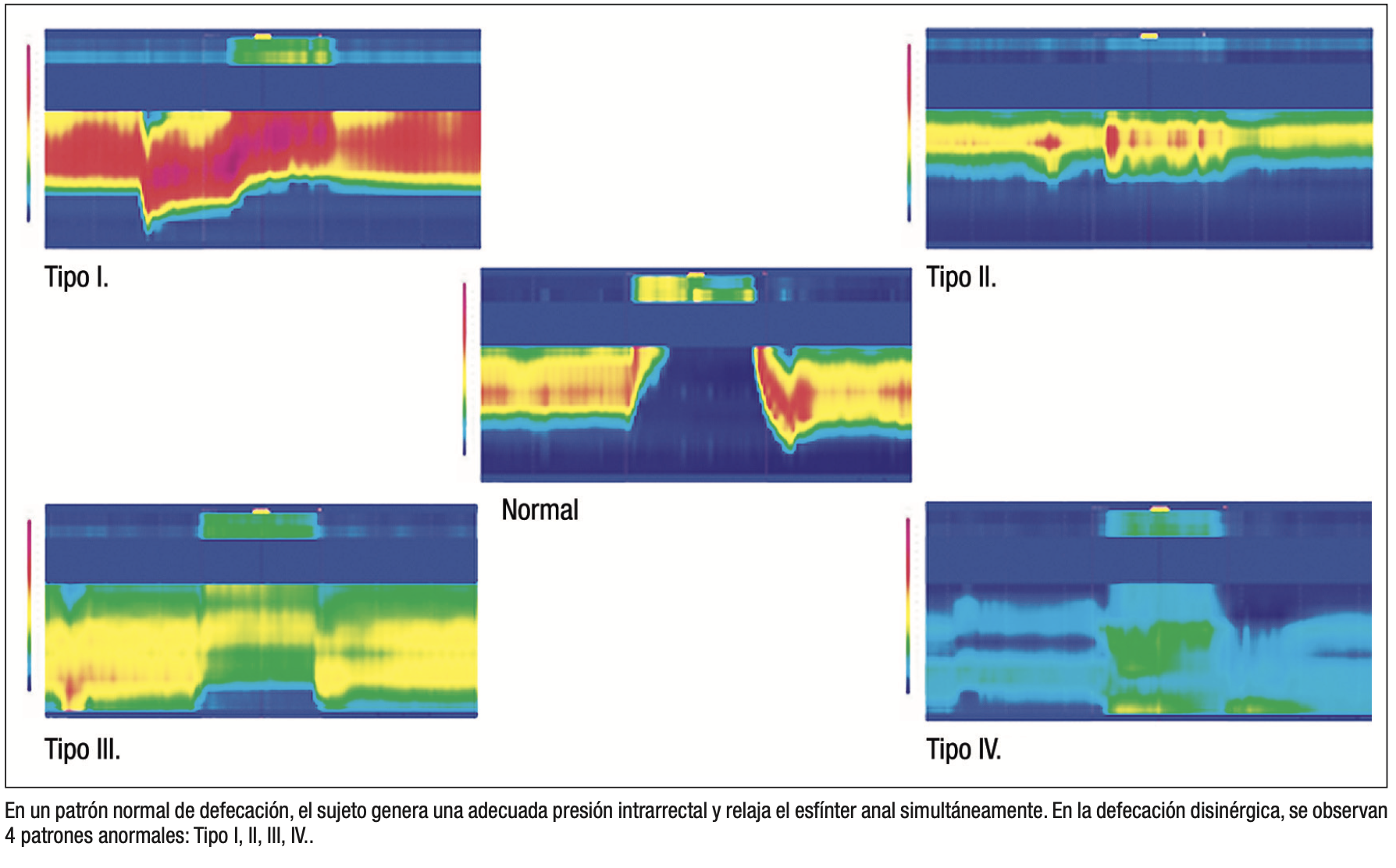 - Disinergia defecatoria, con contracción del suelo pélvico alterada, valorado mediante manometría anorrectal o sonda anal de electromiografía, con una correcta propulsión defecatoria durante la maniobra de defecación.