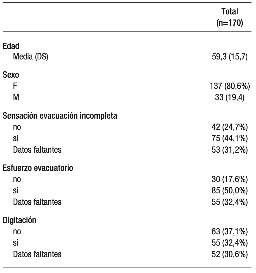 En una muestra total de 170 participantes, la edad promedio fue de 59,3 años con desvío estándar de 15,7 años. En cuanto a la distribución por sexo, el 80,6% (n=137) fueron mujeres y el 19,4% (n=33), hombres. Respecto a la sensación de evacuación incompleta, el 44,1% (n=75) reportó esta sensación; el 24,7% (n=42) no la presentó, y hubo 31,2% (n=53) de datos faltantes. En relación con el esfuerzo evacuatorio, el 50% (n=85) manifestó realizarlo, el 17,6% (n=30) indicó que no, y en el 32,4% (n=55) de los casos la información no estuvo disponible. Finalmente, en cuanto a la digitación, el 32,4% (n=55) la utilizaba, el 37,1% (n=63) no, y el 30,6% (n=52) de los datos no estaban disponibles (Tabla 1).