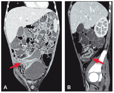 Figura 3. Estenosis de válvula ileocecal. A. VIC, B.