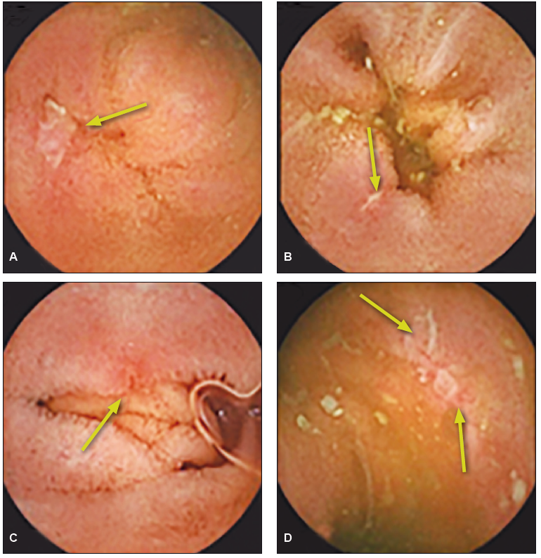 C. Úlcera cubierta con fibrina en íleon. D. Úlceras longitudinales y