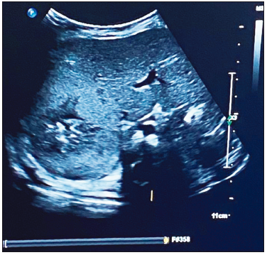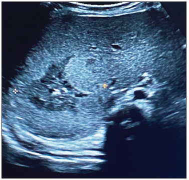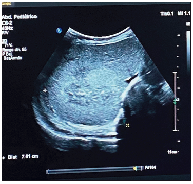 Al ingreso presentó hipotonía axial sin dismorfias. Se solicitó una ecografía abdominal en la que se visualizó una imagen ecogénica hepática (segmento VI - VII), con bordes difusos, de 4 x 3.5 x 3.1 cm, que coincidió bioquímicamente con el aumento de las enzimas hepáticas y leve anemia. La AFP estaba dentro de valores normales para la edad (42,334 ng/ml), con plaquetas normales. (Figuras 1 A B C).