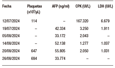 Se realizaron controles semanales de laboratorio. La curva de tendencia mostró un ascenso progresivo de AFP y trombocitosis sostenida (ver Tabla 1). Paralelamente, se encontró anemia y alteración leve de las enzimas hepáticas.