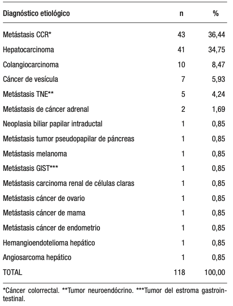 En el período estudiado, sobre un total de 273 hepatectomías, 118 (43,2%) fueron por patología maligna. Las indicaciones quirúrgicas más frecuentes fueron metástasis de cáncer colorrectal (36,4%) seguidas de hepatocarcinoma (34,8%). Las principales etiologías pueden observarse en la Tabla 1. Hubo predominio masculino (n = 65, 55,1%). La media de edad fue de 58 ± 13,4 años. En 26 casos (22%) se trató de pacientes cirróticos, siendo la principal etiología la infección por hepatitis C (61,5%), seguida del alcohol (15,4%).