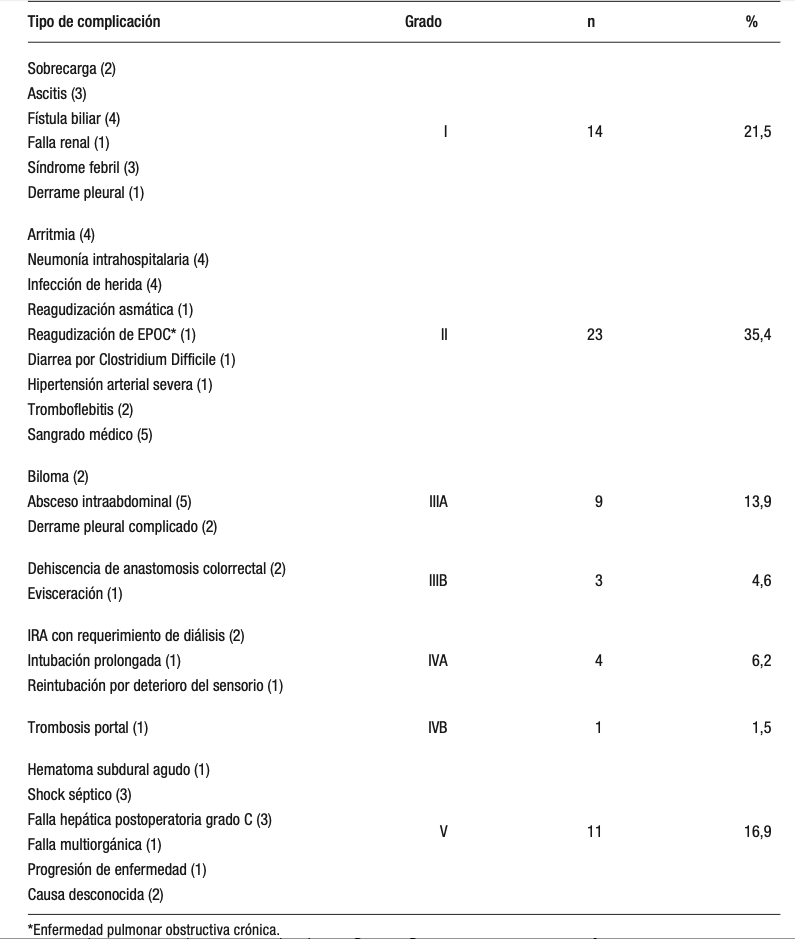 Veinte pacientes (76,9%) correspondieron al estadio BCLC A, mientras que 6 (23,1%) al estadio BCLC 0. Ochenta y cinco pacientes (72%) presentaron un ICC ≥ 5 puntos. Treinta y cinco pacientes (29,7%) habían realizado quimioterapia previamente. El abordaje fue convencional en 98 casos (83,1%) y laparoscópico en 20 (16,9%), con 8 conversiones (6,8%). Las cirugías efectuadas fueron hepatectomías mayores en 56 casos (47,5%). En 16 pacientes (13,6%) se llevaron a cabo resecciones combinadas de otros órganos. La mediana de tiempo quirúrgico fue de 240 minutos (r: 180-300). La mediana de estadía en UTI fue de 3 días (r: 2-5), y la de días de internación fue de 6 (r: 4-11). Cuarenta y cuatro pacientes (37,3%) requirieron transfusiones intraoperatorias de hemoderivados, mientras que 21 (17,8%) las recibieron en el postoperatorio. Cinco pacientes (4,2%) requirieron vasopresores en el postoperatorio inmediato. La morbilidad fue del 55,1% (65 pacientes), y la incidencia de complicaciones mayores fue de 23,7%. Las complicaciones estratificadas por grado pueden observarse en la Tabla 2. La incidencia de insuficiencia hepática postoperatoria fue de 4,2%, correspondiendo dos casos al Grado A y tres al Grado C.