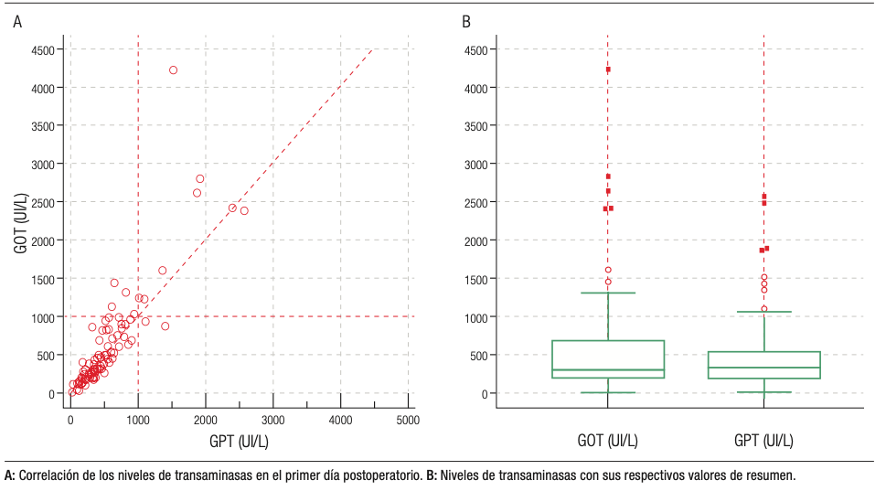 Se analizaron las variables relacionadas a los niveles elevados de GOT. El test de correlación de Spearman evidenció una relación positiva entre los valores de GOT al primer día postoperatorio y el tiempo quirúrgico (rho: 0,4663, p << 0.001). Otros factores que se asociaron a mayores niveles de la enzima fueron las hepatectomías mayores (mediana 492,5 r: 303,5 vs. mediana 223,5 r: 156-387, p << 0,001), el requerimiento de drogas vasoactivas en el postoperatorio inmediato (mediana 1604 r: 1314-2388 vs. mediana 305 r: 200-530, p = 0,004), la realización de la maniobra de Pringle (mediana 477 r: 273-884 vs. mediana 302,5 r: 178-528, p = 0,0046), las transfusiones de hemoderivados intra (mediana 483 r: 269-982,5 vs. mediana 270 r: 157-437, p = 0,0001) y postoperatorias (mediana 492 r: 306-947 vs. mediana 299 r:184-528, p = 0,009) y la ausencia de cirrosis (mediana 346,5 r: 221,5-708,5 vs. mediana 214 r: 156-324, p = 0,0154).
