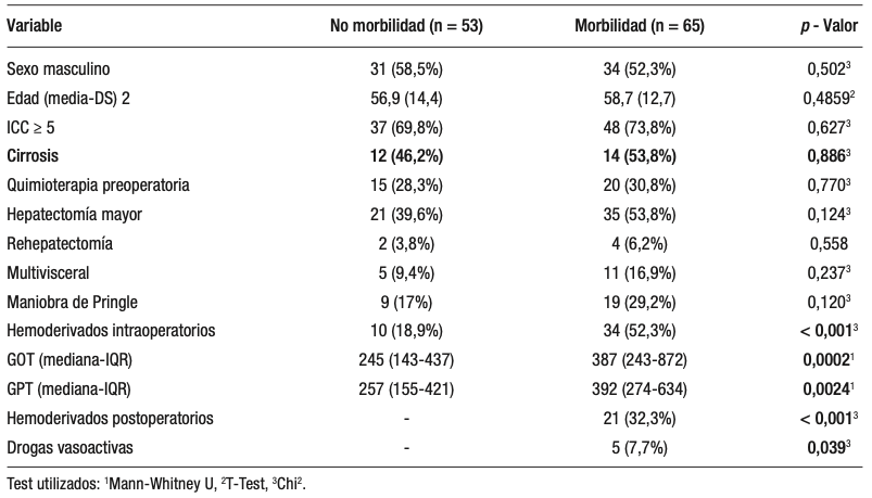 El análisis estadístico halló una relación significativa entre el desarrollo de complicaciones y los valores de GOT (mediana 387, r: 243-872 vs. mediana 245, r: 143-437, p = 0,0002) y GPT (mediana 392 r: 274-634 vs. 257 r: 155-421, p = 0,0024), el requerimiento intra y postoperatorio de hemoderivados (ambas p << 0,001) y el requerimiento de drogas vasoactivas en el postoperatorio inmediato (p = 0,039). No se hallaron diferencias significativas en cuanto a edad, sexo, comorbilidades, diagnóstico de cirrosis, tratamiento quimioterápico previo, magnitud de la hepatectomía, resección combinada de otros órganos y rehepatectomía (Tabla 3).