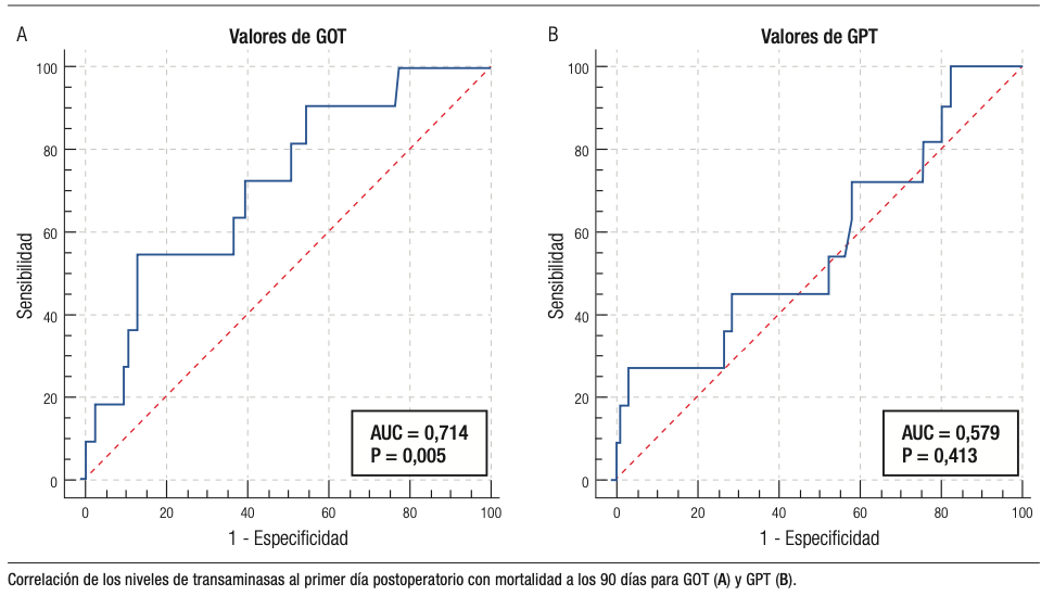 Se realizó un análisis de la curva ROC (Figura 2) para examinar el valor predictivo de los niveles de GOT y GPT en el primer día postoperatorio como indicadores de mortalidad quirúrgica a los 90 días. Los valores del área bajo la curva (AUC) para GOT y GPT predictores de mortalidad fueron 0,714 y 0,579, respectivamente; siendo el primero clasificado como aceptable y el segundo como regular. Se determinaron los valores de corte óptimos para la predicción de mortalidad postoperatoria utilizando los niveles de GOT y GPT en toda la cohorte, los cuales fueron de 856 (sensibilidad 54,6%, especificidad 93%) y 1341 (sensibilidad 27,3%, especificidad 97,2%) UI/L, respectivamente.