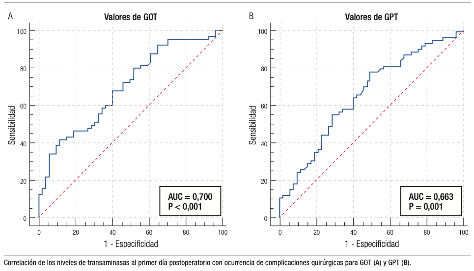 Se llevó a cabo un análisis de la curva ROC (Figura 3) para examinar el valor predictivo de los niveles de GOT y GPT en el primer día postoperatorio como indicadores de ocurrencia de complicaciones quirúrgicas. Los valores del área bajo la curva para GOT y GPT predictores de morbilidad fueron 0,700 y 0,663, respectivamente, siendo el primero clasificado como valor predictivo aceptable y el segundo como regular. Se determinaron los valores de corte óptimos para la predicción de ocurrencia de complicaciones postoperatorias utilizando los niveles de GOT y GPT en toda la cohorte, los cuales fueron de 530 (sensibilidad 41,5%, especificidad 88,7%) y 257 (sensibilidad 78,5%, especificidad 50,9%) UI/L, respectivamente.