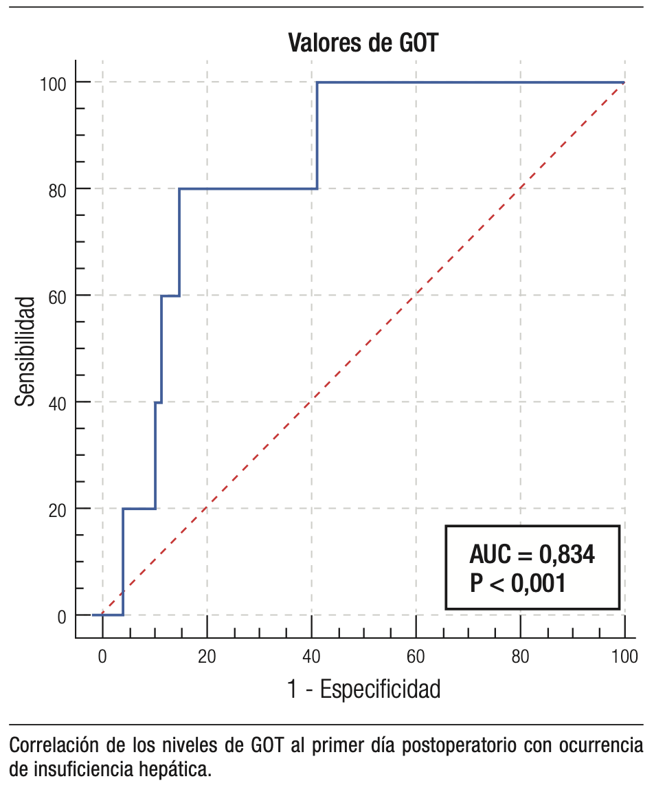 El análisis de la curva ROC (Figura 4) para evaluar el poder predictivo de GOT en el primer día postoperatorio como indicador de insuficiencia hepática reveló un área bajo la curva de 0,834, que se traduce en un valor predictivo sobresaliente. Se determinó un valor de corte óptimo para GOT > 856 UI/L (sensibilidad 80%, especificidad 85%).