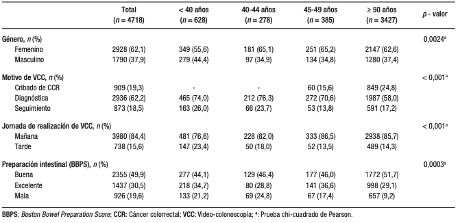 Se recuperaron 4781 VCC/pacientes: 13,1% en < 40 años, 5,8% en 40-44, 8,1% en 45-49 y 71,7% en ≥ 50; 62,1% femenino. El principal motivo de VCC fue diagnóstico en el 62,2%. El 80,4% con buena o excelente preparación (Tabla 1).