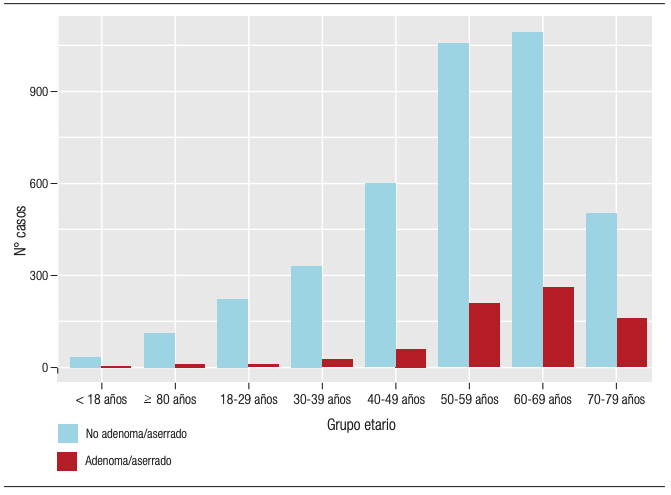 No obstante, también existe evidencia latinoamericana al respecto. Un estudio colombiano en el que se consideró como casos y controles pacientes entre 45-49 y 50-75 años demostró una frecuencia de pólipos colorrectales del 36,7% y 42,5%; y de adenomas/aserrados del 18,5% y 32,4%, respectivamente. De forma semejante, se concluyó que el inicio del cribado del CCR mediante VCC debe ser a los 45 años.8