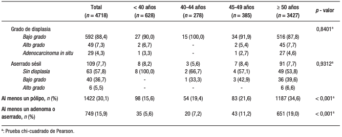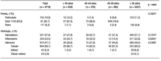 Se identificó al menos un pólipo en el 15,6% de los pacientes < 40 años, 19,4% en el rango 40-44, 21,6% en el de 45-49 y 34,6% en los ≥ 50 (p < 0,001) (Figura 1).