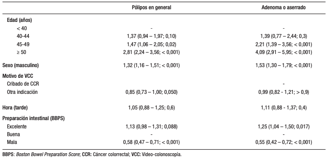 En conclusión, aunque los resultados de PALTA no describen la frecuencia de pólipos colorrectales en una población general, sí demuestran el incremento significativo aun en < 50 años, en una importante muestra hospitalaria. Se sugiere reducir en dos a tres años la edad de corte de inicio de cribado de CCR. Una mayor identificación de pólipos o adenomas está significativamente asociada a factores tales como: edad mayor a 45 años, sexo masculino, y una excelente preparación intestinal. Una mala preparación intestinal está significativamente asociada con una menor identificación tanto de pólipos como de adenomas. Es necesario evaluar el inicio del cribado de CCR mediante VCC a una edad más temprana.