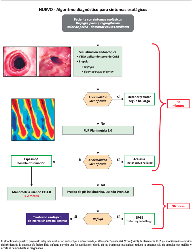 Los síntomas esofágicos -incluyendo la disfagia, la pirosis, la regurgitación y el dolor torácico no cardiogénico- se encuentran entre las indicaciones más frecuentes de derivación a gastroenterología. A pesar de su elevada prevalencia, el establecimiento de un diagnóstico etiológico definitivo continúa siendo un desafío clínico relevante, debido a la marcada superposición de perfiles sintomáticos entre la enfermedad por reflujo gastroesofágico, la esofagitis eosinofílica, los trastornos motores esofágicos y los trastornos de la interacción intestino-cerebro. Los paradigmas diagnósticos vigentes se basan, en general, en estrategias secuenciales que con frecuencia comienzan con un tratamiento empírico con inhibidores de la bomba de protones, seguido de una endoscopía digestiva alta y, cuando esta no resulta concluyente, de estudios funcionales esofágicos basados en catéter. Este enfoque se asocia a tiempos diagnósticos prolongados, estudios incompletos por mala tolerancia, demoras en el acceso a centros especializados y un incremento sustancial de los costos sanitarios. Los avances recientes en las tecnologías endoscópicas y funcionales ofrecen la oportunidad de replantear de manera fundamental la evaluación de los síntomas esofágicos. La integración de herramientas de estratificación endoscópica de riesgo -como el Clinical Achalasia Risk Score- junto con la planimetría mediante Functional Lumen Imaging Probe y el monitoreo inalámbrico del pH, permite realizar una evaluación fisiológica integral durante la endoscopía índice, bajo sedación, optimizando el rendimiento diagnóstico del procedimiento. Esta estrategia tiene el potencial de reducir significativamente la incertidumbre diagnóstica, acortar el tiempo hasta el diagnóstico definitivo y disminuir la dependencia de estudios con catéter mal tolerados. En esta revisión se sintetiza la evidencia emergente que respalda un paradigma diagnóstico centrado en la endoscopía índice como evento diagnóstico central e integrador. Se analizan las limitaciones de los métodos diagnósticos tradicionales, se revisan los principios fisiológicos y la utilidad clínica de la planimetría mediante Functional Lumen Imaging Probe y el monitoreo inalámbrico de reflujo. Se propone un algoritmo práctico que integra esas herramientas, con el objetivo de brindar una atención de precisión y eficiente, orientada a mejorar el rendimiento diagnóstico y la toma de decisiones terapéuticas en los pacientes con síntomas esofágicos. Dado que la evidencia disponible es emergente y se concentra en centros con experiencia, el algoritmo propuesto debe interpretarse como un marco pragmático para optimizar la secuencia diagnóstica, sujeto a validación prospectiva y adaptación al contexto local.