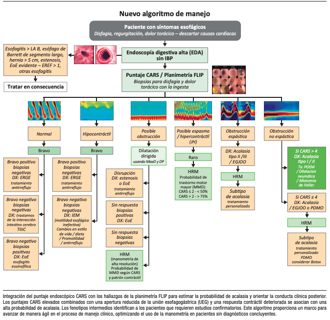 La planimetría FLIP estratifica a los pacientes según la dinámica de apertura de la UEG y la respuesta contráctil. Los pacientes con apertura reducida de la UEG y respuesta contráctil deteriorada o ausente, particularmente en el contexto de un puntaje CARS elevado, presentan una alta probabilidad de presentar acalasia, y podrían avanzar directamente a un tratamiento definitivo sin necesidad de manometría confirmatoria. En contraste, los pacientes con patrones contráctiles espásticos-reactivos podrían ser derivados a manometría de alta resolución para definir el subtipo y guiar una estrategia terapéutica personalizada.