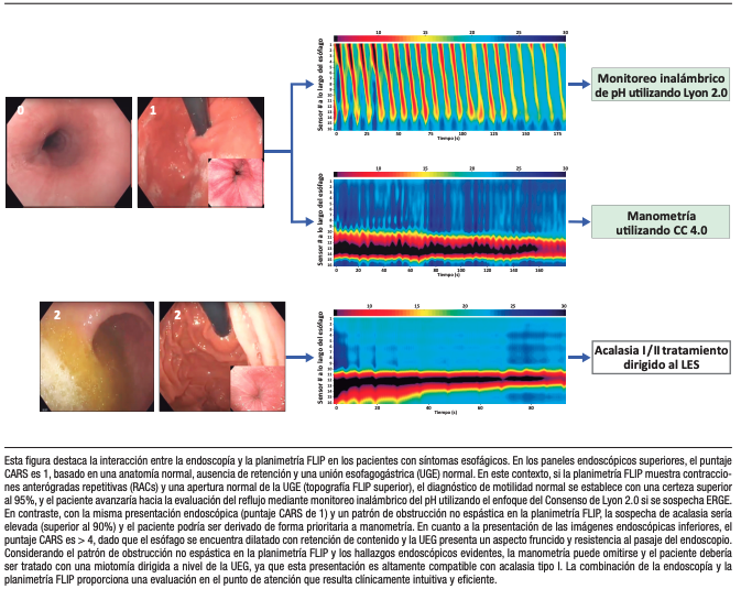 Actualmente los avances en la evaluación fisiológica endoscópica permiten ir más allá del rol puramente excluyente de patología orgánica de la endoscopía. Durante la endoscopía bajo sedación pueden utilizarse herramientas como la planimetría FLIP y el monitoreo inalámbrico del pH (colocación de la capsula), proporcionando una evaluación en tiempo real de la motilidad esofágica, la dinámica de apertura de la unión esofagogástrica (UEG) y la carga de reflujo. Cuando se combinan con sistemas estructurados de estratificación endoscópica de riesgo, como el Clinical Achalasia Risk Score (CARS),4, 5 estas tecnologías permiten un enfoque diagnóstico de precisión integrado durante la endoscopía índice.