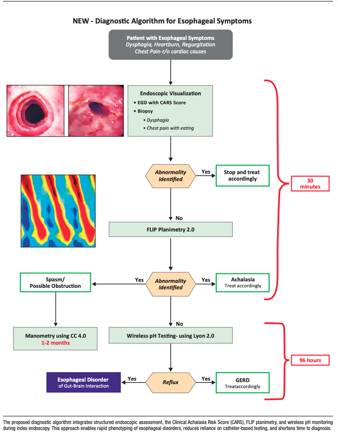 Advances in endoscopic physiologic assessment now allow us to go beyond the purely exclusionary role of organic pathology in endoscopy. During endoscopy under sedation, tools such as FLIP planimetry and wireless pH monitoring (capsule placement) can be used, providing real-time assessment of esophageal motility, esophagogastric junction (EGJ) opening dynamics, and reflux burden. When combined with structured endoscopic risk stratification systems, such as the Clinical Achalasia Risk Score (CARS),4, 5 these technologies enable an integrated precision diagnostic approach during index endoscopy.