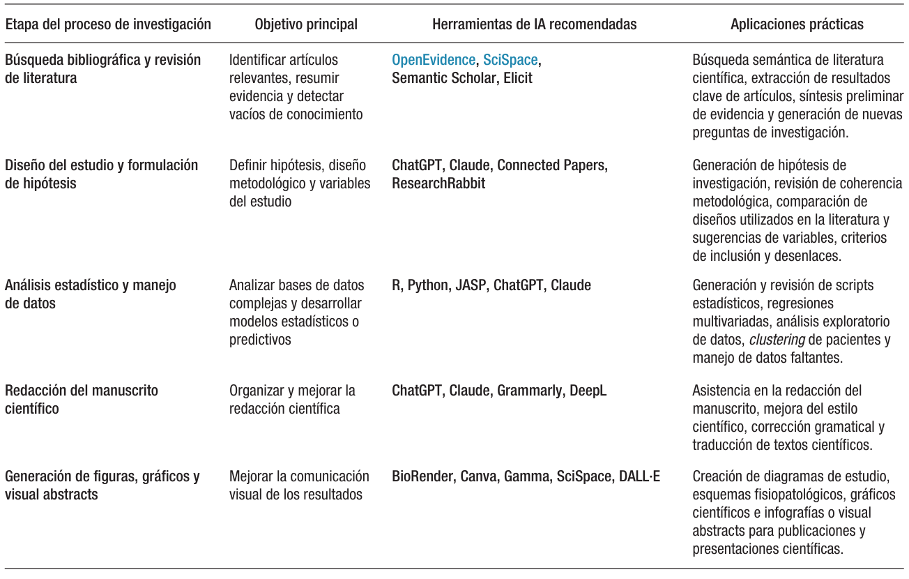 En los últimos años han surgido diversas herramientas basadas en inteligencia artificial que pueden asistir al investigador en las distintas etapas del proceso científico, desde la búsqueda bibliográfica hasta la comunicación visual de los resultados. En la fase inicial, plataformas como OpenEvidence y SciSpace permiten realizar búsquedas semánticas en la literatura científica, resumir artículos y extraer información relevante de forma eficiente, facilitando la identificación de vacíos de conocimiento y la formulación de nuevas preguntas de investigación. Durante el diseño metodológico y la planificación del estudio, modelos de lenguaje como ChatGPT y Claude pueden colaborar en la estructuración de hipótesis, la definición de variables y la revisión de la coherencia del protocolo. En la etapa de análisis de datos, estas herramientas también pueden utilizarse como apoyo para la generación de scripts en entornos estadísticos como R o Python, la exploración de bases de datos complejas y la interpretación preliminar de resultados. Asimismo, en la redacción científica pueden contribuir a mejorar la claridad del texto, organizar el manuscrito y facilitar su traducción a otros idiomas. Finalmente, para la comunicación visual de los hallazgos, plataformas como BioRender, Canva, Gamma o SciSpace permiten generar esquemas, figuras científicas y visual abstracts que facilitan la difusión de los resultados. Si bien estas herramientas pueden aumentar la eficiencia del proceso de investigación, su utilización debe considerarse complementaria al criterio clínico y al rigor metodológico del investigador (Tabla 1).