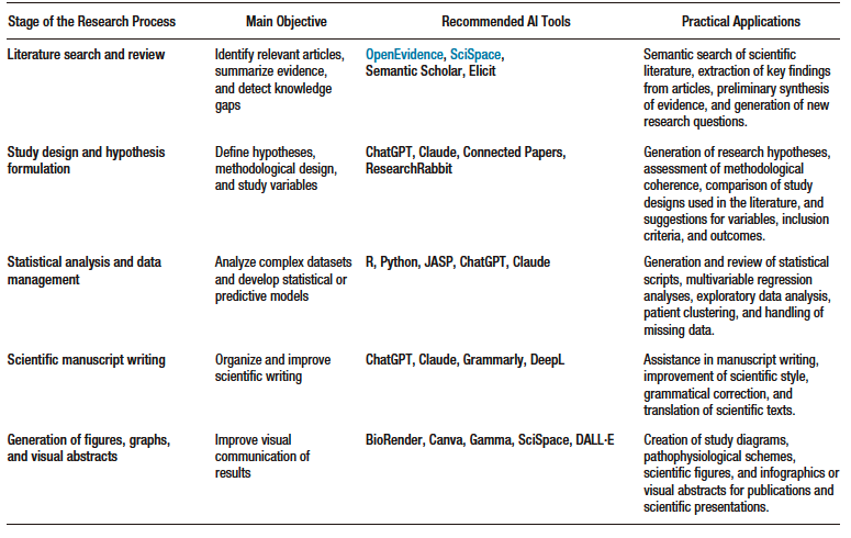 In recent years, various AI-based tools have emerged that can assist researchers at different stages of the scientific process, from literature search to the visual communication of results. In the initial phase, platforms such as OpenEvidence and SciSpace enable semantic searches of the scientific literature, summarization of articles, and efficient extraction of relevant information, facilitating the identification of knowledge gaps and the formulation of new research questions.